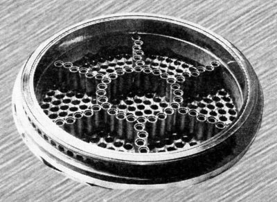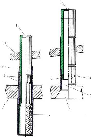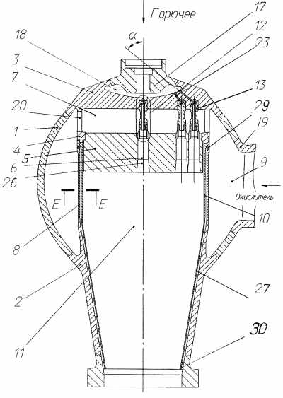 Для подавления пульсаций давления начальная зона смесеобразования и горения, в которой, как правило, зарождаются высокочастотные колебания, разделена на семь примерно одинаковых объемов с помощью антипульсационных перегородок, состоящих из выступающих за огневое днище форсунок, которые неплотно прилегают друг к другу по своим цилиндрическим образующим. Благодаря этому резко повышаются собственные частоты колебаний в объемах между перегородками, смещаясь далеко от резонансных частот конструкции камеры сгорания. Кроме того, выступающие форсунки растягивают зону горения, что также уменьшает возможность возникновения высокочастотных явлений. Зазоры между неплотно прилегающими друг к другу выступающими форсунками оказывают дополнительное демпфирующее влияние. Выступающая за огневое днище часть форсунки охлаждается горючим, проходящим по спиральным каналам (шнековому завихрителю) 6 внутренней втулки.
