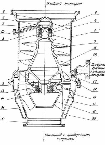 При работе БНАО на вход насоса подается жидкий кислород (показано стрелкой), а продукты сгорания с избытком кислорода, отбираемые из газовода после турбины основного ТНА (см. ПГС на рис. 2), подаются на вход турбины (показано стрелкой). Продукты сгорания далее попадают на профилированные лопатки 17 турбины, обеспечивая подачу жидкого кислорода шнеком 7. За турбиной продукты сгорания через отверстия 19 попадают в полость патрубка 20, а затем через отверстия 21 на выход насоса, где происходит их смешивание с жидким кислородом и конденсация. Для решения проблемы возникновения низкочастотных пульсации при конденсации газа применено дроблении потока, сбрасывающего газ. Разгрузка шнека 7 от действий осевых сил обеспечивается подачей жидкого кислорода высокого давления (см. рис. 2.2) через канал высокого давления 10 в полость высокого давления авторазгрузочного устройства. В месте малого зазора между рабочим колесом и корпусом в полости высокого давления авторазгрузочного устройства используется серебряная накладка, предтаращающая возгорание при возможном касании. В магистрали подвода продуктов сгорания к турбине БНАО установлен клапан "горячего газа" (45 на рис.2.1), работающий в условиях кислородного генераторного газа с высокой температурой и при высоком давлении.