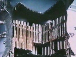 Пусковой бачок содержит силовую оболочку 1, выполненную в форме полусферы, и трубчатый фланец 2, сопряженный на своем торце с торцом силовой оболочки 1. Трубчатый фланец 2 расположен вдоль продольной оси упомянутой полусферы силовой оболочки 1 и на его внутренней поверхности выполнена кольцевая канавка 3. Штуцер 4 для заправки и выдачи жидкости установлен в силовой оболочке 1. Прижимное кольцо 5 расположено соосно продольной оси силовой оболочки 1. Эластичная диафрагма 6 закреплена между трубчатым фланцем 2 и прижимным кольцом 5 и выполнена в форме полусферы, сопряженной с цилиндром, на наружной поверхности в основании которого выполнен концевой выступ 7, размещенный в кольцевой канавке 3 трубчатого фланца 2. Наружная поверхность прижимного кольца 5 и внутренняя поверхность трубчатого фланца 2 в месте размещения концевого выступа 7 в кольцевой канавке 3 выполнены цилиндрическими. Устройство имеет днище 8, выполненное в форме части сферы, с возможностью воздействия его торца на торец прижимного кольца 5 и герметичного соединения с трубчатым фланцем 2 силовой оболочки 1. Штуцер 9 для подвода управляющего газа установлен в днище 8. В конструкцию введено тонкостенное кольцо 10, на котором выполнен бурт 11 и которое установлено между прижимным кольцом 5 и эластичной диафрагмой 6 в месте расположения ее кольцевого выступа 7. Рассекатель 16 выполнен в виде пластины, перфорированной отверстиями 21, края которой прикреплены к внутренней поверхности днища 8 в полости 14, соединенной со штуцером 9 для подвода управляющего газа. Рассекатель 16 с отверстиями 21 служит для равномерного воздействия потока газа на эластичную диафрагму 6. Работает устройство следующим образом (см. также раздел работа ПГС). Через штуцер 4 происходит заполнение бачка основным горючим, при этом происходит перекладка эластичной диафрагмы 6 на днище 8. Затем подается управляющий газ через штуцер 9, под действием которого диафрагма 6 перекладывается в исходное положение, вытесняя основное горючее через штуцер 4. Благодаря принятой конструкции узла крепления концевого участка эластичной диафрагмы при высоком давлении обеспечивается герметичность при многоразовых перекладках (более 450), и обеспечивается возможность перегиба эластичной оболочки практически без ее растяжения.