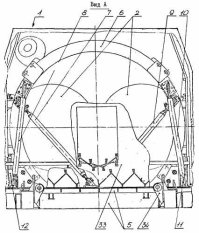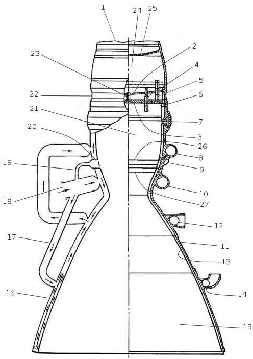 Сильфон 13 выполнен многослойным и снабжен защитными кольцами 21, вставленными между гофрами 22 сильфона 13. Снаружи защитных колец 21 установлен плотно прилегающий к ним кожух 23, выполненный из слоев цилиндрических спиралей 24, соединенных концами с опорными кольцами 9 и 10 сильфонного узла. Смежные слои спиралей прилегают друг к другу, а их витки навиты в противоположных направлениях. Установка металлического силового кожуха в виде металлической цилиндрической спирали снаружи защитных колец 21 сильфона 13 повышает его прочностные свойства и в то же время ограничивает самопроизвольный изгиб сильфона 13 при повороте камеры двигателя на сравнительно большие углы (10-12°), тем самым повышая его устойчивость. Турбонасосный агрегат выполнен по одновальной схеме и состоит из осевой одноступенчатой реактивной турбины, одноступенчатого шнекоцентробежного насоса окислителя и двухступенчатого шнекоцентробежного насоса горючего (вторая ступень используется для подачи части горючего в газогенераторы).