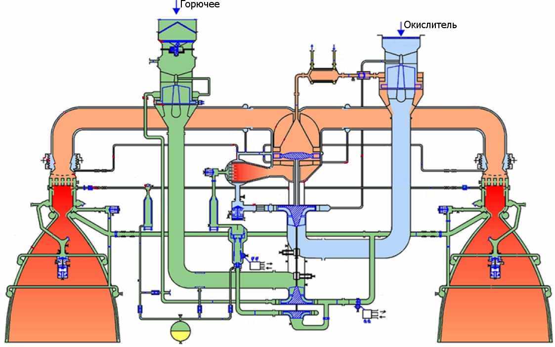 Двигатель выполнен по замкнутой схеме с дожиганием окислительного генераторного газа после турбины.