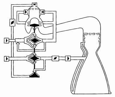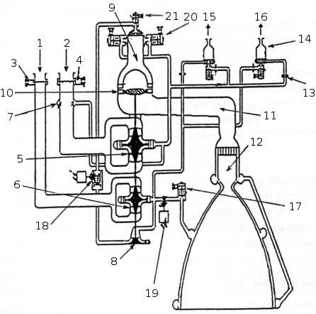 В состав пневмогидравлической схемы двигателя (рис. 2.3) входят следующие агрегаты и системы: камера сгорания, турбонасосный агрегат, система окислителя, система горючего, система газогенерации, агрегаты системы управления и регулирования двигателя, пиротехнические средства, система наддува баков ракеты, система питания РМ. Управление двигателем после команды "Пуск ДУ" производится автоматически, путем подачи электрических команд на соответствующие агрегаты двигателя системой управления ракеты. Процесс работы двигателя включает следующие этапы: запуск, работа на режиме главной ступени и выключение.