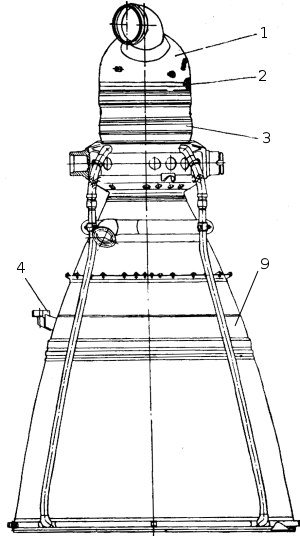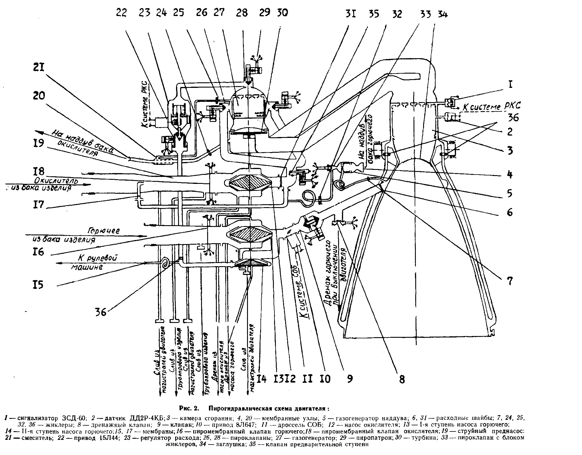 Останов двигателяКоманда на останов двигателей выдается по достижению ракетой заданной скорости через программный токораспределитель. Для уменьшения гидроударов, возникающих в магистралях двигателя при закрытии клапанов, выключение производится в две ступени и за определенное время перед выключением, в случае работы двигателя на режиме форсирования, система РКС обеспечивает перевод работы двигателя на номинальный режим. По первой команде на выключение закрываются пироклапан горючего 28 основного газогенератора и пироклапан 33 окислителя газогенератора наддува, что приводит к прекращению расходов соответствующих компонентов топлива через газогенераторы. По этой же команде происходит выключение систем РКС и СОБ, блокируется сигнализатор давления 1, задействованный в СБН (система безопасности носителя). Вторая команда на выключение двигателя подается через 0,2 ± 0,03 сек. По этой команде закрываются пироклапаны 26 окислителя основного газогенератора, клапан 9 горючего. КС и открывается дренажный клапан 8. При закрытии указанных клапанов прекращается доступ соответствующих компонентов топлива в газогенераторы, камеру сгорания и смеситель. Двигатель прекращает работу. При открытии дренажного клапана 8 горючее из за рубашечного пространства КС выбрасывается в атмосферу для уменьшения импульса последействия. Схема ракеты предусматривает аварийное выключение двигателей при запуске. По решению технического руководителя может быть подана "вручную" команда АВД (аварийное выключение двигателя), если через 2,0±0,1 секунды от команды ГСТ не проходит сигнал КП. Порядок срабатывания агрегатов автоматики при АВД такой же, как и при нормальном выключении двигателей, но при этом открытие дренажного клапана 8 не производится. Кроме того, возможно выключение двигателей при полете ракеты на активном участке от СБН, порядок срабатывания агрегатов такой же, как и при нормальном выключении.