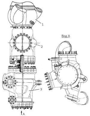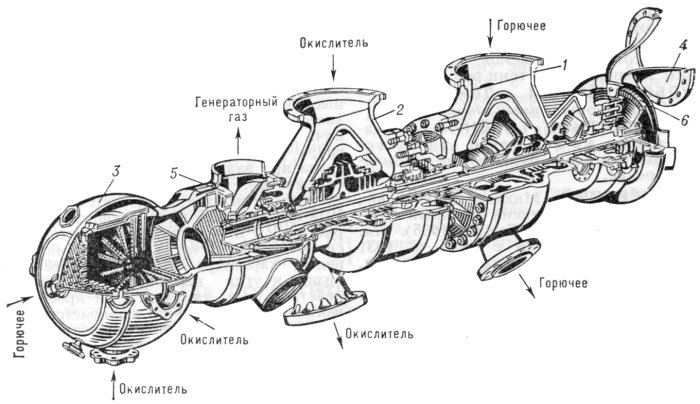 Струйный преднасос создает дополнительный напор (0.17 МПа) на входе в насос окислителя, что обеспечивает бескавитационную работу насоса при достаточно низком давлении в баке. Представляет собой сварную конструкцию и состоит из соплового аппарата, конфузора 2, смесительной камеры 3 и диффузора 4. Окислитель под высоким давлением подводится в коллектор соплового аппарата. Из коллектора через отверстия в кольце активный поток направляется в конфузор и смесительную камеру 3, где. смешиваясь с основным потоком компонента, сообщает дополнительную скорость основному потоку. В диффузоре 4 скоростной напор потока преобразуется в статическое давление.