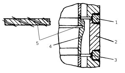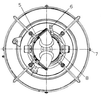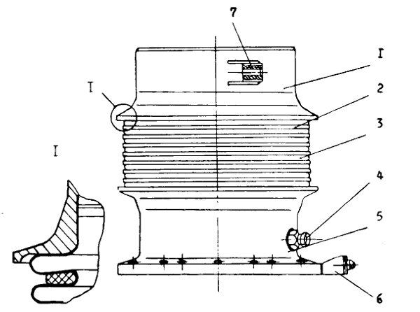 Компенсатор обеспечивает возможность качания изделия на угол ±8. Гибкой частью компенсатора является сильфон 3, приваренный к кольцу 1 и фланцу 5. Между гофрами сильфона расположены резиновые кольца 2 для сохранения профиля гофра при наличии давления внутри сильфона и изгиба компенсатора при качании изделия.