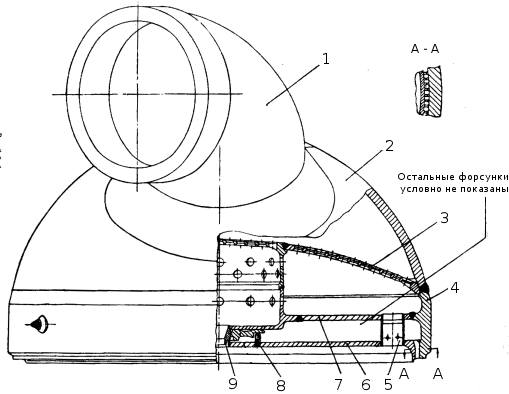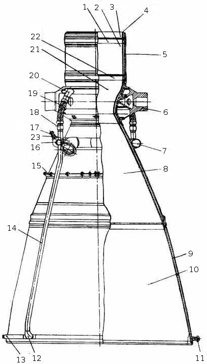 КС, включающая цилиндрический участок камеры, докритическую и закритическую части сопла, состоит из следующих основных узлов: двух секций цилиндра 3 и 2; двух поясов завесы 1 и 22; средней части 21; первой секции сопла 8; сопла-надставки 10. Каждый из основных узлов состоит из внутренней стенки и наружной рубашки. Внутренние стенки цилиндра, завесы, средней части и первой секции сопла соединяются между собой сваркой, а рубашки свариваются при помощи соединительных колец. Наружные рубашки с внутренними стенками секций цилиндра, поясов завесы, средней части и первой секции сопла спаяны по вершинам ребер, выфрезерованных на наружной поверхности стенок. Образованные ребрами каналы служат для протока охлаждающей жидкости. На внутренней стенке каждого пояса завесы имеется кольцевая канавка, сообщающаяся при помощи тангенциальных отверстий (сечение по АА) с зарубашечным пространством. К рубашке средней части 21 приварен бандаж с цапфами 6. На первой секции сопла 8 находится коллектор 7 с патрубком 17 (угольником) для ввода горючего. Для прохода "Г" из коллектора в зарубашечное пространство в рубашке просверлены отверстия. От штуцера 23 производится отбор горючего к газогенератору наддува. На перегородке 15, припаянной к рубашке, крепится защита двигателя. Для крепления ТНА приварен кронштейн 4. Стенка и рубашка сопла-надставки 10 соединены между собой пайкой через гофрированные проставки 9. Коллектор 13 с патрубками 12 (угольниками) служит для отвода охладителя из зарубашеченное пространства сопла-надставки. На коллекторе имеется штуцер 11 для слива горючего. Перепуск горючего из коллектора 13 в коллектор бандажа 6 производится по четырем трубопроводам 14, приваренным к угольникам 12 и 20. Температурная компенсация длины трубопроводов обеспечивается гибкими шлангами 19. Внутренние стенки цилиндра, завесы, средней части и первой секции сопла изготовлены из специальной бронзы. Наружная рубашка, коллекторы и бандаж с цапфами выполнены из нержавеющей стали повышенной прочности. На внутренние поверхности стенок, кроме щелей завесы и сопла-надставки, нанесено циркониевое покрытие. Окислитель поступает в форсуночную головку из ГГ в виде окислительного газа, горючее подводится к коллектору 7, откуда проходит по зарубашечному тракту КС и поступает в ФГ с некоторым запаздыванием относительно окислителя. Из полостей окислителя и горючего ФГ компоненты топлива через форсунки впрыскиваются в цилиндрическую часть камеры, где протекает процесс сгорания распыленного топлива. В сопле происходит расширение газа, сопровождающееся уменьшением его давления, температуры и увеличением скорости истечения.