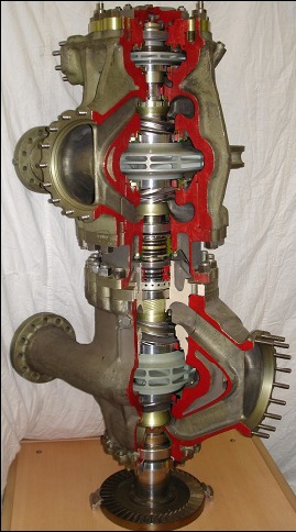Турбонасосный агрегат обеспечивает подачу компонентов топлива в камеру сгорания, газогенератор, смеситель и рулевую машинку. Турбонасосный агрегат включает в себя одноступенчатую газовую турбину реактивного типа, насосы окислителя и горючего центробежного типа. Насос горючего - двухступенчатый. Конструктивно ТНА состоит из двух узлов: насоса окислителя с турбиной и насоса горючего. Корпусы насосов и турбины в сборе образуют общий жесткий корпус ТНА. В корпусах насосов установлены штуцеры, к которым подсоединяются магистрали слива и дренажа компонентов. На корпусе насоса горючего имеется проушина для размещения опоры. ТНА имеет два вала: вал насоса окислителя и турбины и вал насоса горючего. Валы между собой соединены рессорой, обеспечивающей надежную передачу крутящего момента с вала насоса окислителя на вал насоса горючего при возможных взаимных смещениях и перекосах осей валов. Каждый вал установлен на двух шариковых подшипниках, один из которых имеет осевую фиксацию. Охлаждение и смазка двух подшипников (по одному в насосах окислителя и горючего) осуществляется компонентами, двух других консистентной смазкой. Насос окислителя и первая ступень насоса горючего имеют крыльчатки закрытого типа с двухсторонним подводом компонентов топлива, а вторая ступень насоса горючего крыльчатку закрытого типа с односторонним подводом горючего. Для обеспечения бескавитационной работы насосов перед входом в крыльчатки установлены осевые преднасосы - шнеки. Осевое усилие, возникающее на рабочем колесе турбины разгружается при помощи авторазгрузочного устройства. Использование в двигателе самовоспламеняющихся компонентов топлива потребовало введения в конструкцию ТНА надежной системы уплотнений. Герметичность полостей насосов и турбины обеспечивается применением уплотнении манжетного и сильфонного типа и гидрозатворов. В случае просачивания компонентов через уплотнения, они отводятся из специально предусмотренных дренажных полостей через соответствующие дренажные трубопроводы. Таблица 3. Параметры ТНА [7]