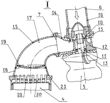 Высокие удельная тяга и запасы устойчивости горения при простом конструктивном исполнении в значительной степени обеспечены конфигурацией тракта генераторного газа. Газовый тракт объединяет три основные сборочные единицы двигателя: камеру сгорания 4, турбонасосный агрегат 5 и газогенератор 6. Камера сгорания скреплена с ТНА по плоскости стыковки 7, причем ТНА с соосным ему газогенератором расположен сбоку от камеры сгорания. При этом ось камеры 8 и ось ТНА 9 образуют небольшой острый угол. ТНА снабжено консольной осевой газовой турбиной 10 с ее валом 11, которая помещена в полом корпусе 12 турбины с его внутренней лобовой поверхностью 13, выхлопным патрубком 14 и плоскостью стыковки 15 с корпусом газогенератора 16. Полый корпус газогенератора с полым корпусом турбины и выхлопным патрубком образуют Г-образное колено для протока генераторного газа с возможностью приведения колеса турбины 10 во вращение. Углы в колене, а именно в корпусе 12, плавно скруглены, а плоскость вращения колеса турбины установлена под прямым углом к плоскости стыковки 7 выхлопного патрубка 14 турбины и входного патрубка 15 газовода 17 камеры сгорания. Газовод 17 выполнен кривоосным, диффузорным и состоит из последовательно скрепленных входного патрубка 15 и конического переходника 18. Внутри патрубка 15 установлена вогнутая по направлению потока выравнивающая решетка 19, которая ограничивает предфорсуночную полость 20. Угол изгиба газовода составляет менее 90°, причем осевые линии газовода 17, патрубка 14, турбины 10 и газогенератора 6 лежат в одной плоскости. Входной патрубок в плоскости стыковки 7 с ТНА выполнен с круглым проходным сечением 21, и плоскость вращения колеса турбины расположена в таком продольном положении относительно газовода 17, что она проходит через верхнюю половину плоскости стыковки 7. Практически это условие определяет осевое положение ТНА в пространстве около камеры сгорания. В целом, Г-образное колено, образованное корпусом газогенератора 16 и выхлопным патрубком 14 турбины и сопряженное с кривоосным газоводом 17, образует расположенный в одной плоскости тракт генераторного газа с выходом его на форсуночную головку 23. Газовод 17 выполнен длиной по осевой линии, равной не менее 1.3 наибольшего диаметра переходника 18, и степенью расширения газовода не более 4.6. Выравнивающая решетка 19 выполнена из листового материала, причем периферийная ее часть выполнена конической с соблюдением перпендикулярности стенки к стенке входного патрубка 15, а донная ее часть - сферической. Решетка установлена по осевой линии входного патрубка на удалении от плоскости стыковки 7, равном не менее 0.8 от длины газовода, а от входа в газовые форсунки на расстоянии по оси камеры сгорания, равном, как минимум, шести диаметрам центральных отверстий в решетке. Решетка 19 выполнена с увеличенными коэффициентами живого сечения на участке, прилегающем к минимальному радиусу канала входного патрубка, и на периферийных участках по сравнению с коэффициентом живого сечения на центральных участках. Основные газовые форсунки 30 форсуночной головки 23 изготовлены с относительной длиной газовых каналов форсунок не менее 6, а сама форсуночная головка выполнена с коэффициентом живого сечения, равным 0.18-0.2. Двигатель работает следующим образом. Генераторный газ, выработанный в генерат