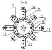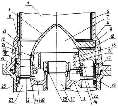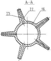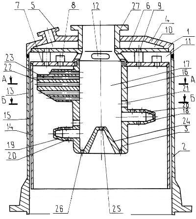 Рис.9. Схема газогенератора [16] Газогенератор содержит головку 1, камеру 2, распределитель 3. Головка 1 содержит переднее днище 4 с патрубком подвода горючего 5, среднее днище 6, огневое днище 7, форсунки окислителя 8, форсунки горючего 9. Между передним 4 и средним 6 днищами образована полость 10 для подвода горючего к форсункам 9, а между огневым днищем 7 и средним днищем 6 образована полость 11 для подвода окислителя к форсункам 8. В среднем днище 6 выполнены пазы 12 для подвода окислителя в полость 11. Камера газогенератора содержит наружный корпус 13 и внутреннюю оболочку 14, между которыми имеются каналы 15 для прохода окислителя. Распределитель 3, расположенный по оси газогенератора, содержит цилиндр 16 с полостью 17 избыточного компонента, смесительные элементы 18 и 19 в виде полых цилиндров, закрытых шатровыми головками и перфорированных отверстиями 20. Перед каждым смесительным элементом выполнены отверстия 21. Смесительные элементы расположены в шахматном порядке, а их высота уменьшается по потоку газа. Между огневым днищем 7 и смесительными элементами 18 расположены радиальные профилированные пластины 22 ("крылышки") с каналами 23 подачи компонента из полости 17 в полость камеры газогенератора. Распределитель закрыт днищем 24 в виде усеченного конуса, обращенного вершиной в сторону огневого днище 7, а в месте перехода цилиндра в днище и в вершине конуса выполнены отверстия 25 и 26. Головка 1 газогенератора снабжена патрубком 27 для подвода окислителя в полость 11 к форсункам 8, а его избыточной части в полость 17 распределителя 16. При работе газогенератора горючее через патрубок 5 поступает в полость 10 головки 1, откуда через форсунки 9 распыленным подается в камеру 2. Окислитель через патрубок 27 поступает по пазам 12 в полость 11, откуда по форсункам 8 в распыленном виде подается в камеру 2 и частично по каналам 15 поступает на охлаждение внутренней оболочки 14. Большая (избыточная) часть окислителя поступает в полость 17 распределителя, откуда по элементам 18, 19 через отверстия 20 поступает в поток горячего газа, идущий со стороны головки 1. Часть окислителя из полости 17 поступает в поток по отверстиям 23 в пластинах 22. Этим обеспечивается равномерная раздача холодного окислителя по всему сечению камеры 2 и равномерное его перемешивание с потоком горячего газа на коротком по длине участке. Коническое днище 24 распределителя обеспечивает плавный поворот потока окислителя в полости 17 от осевого направления в радиальное (в элементы 18, 19). Часть окислителя, поступающая через отверстия 25 и 26 в зону за днище 24, сдувает зону завихрений за днищем. Таким образом обеспеченивается перемешивания на коротком участке, что позволило уменьшить длину газогенератора и его вес.