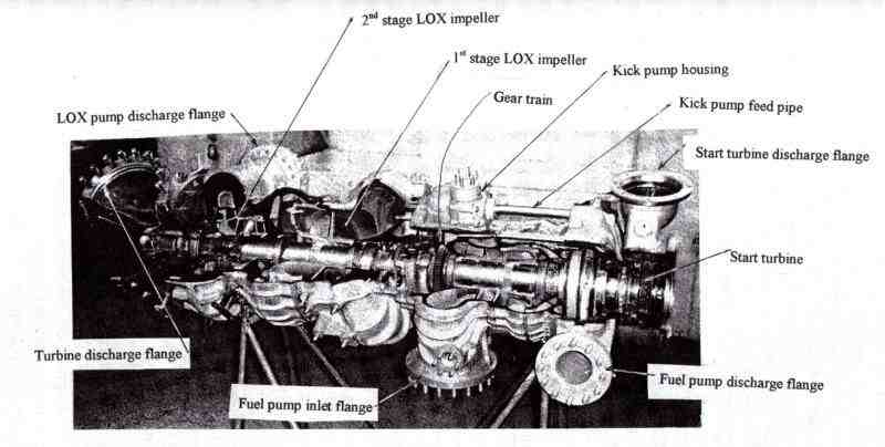 Насос окислителя 2 состоит из двух каскадов с раздельными валами 3 и 4, каждый каскад включает предвключенный шнек 5, 6 и центробежную крыльчатку 7, 8. Насос 2 снабжен входным патрубком 9 и выходным патрубком 10. Привод вращения каскада низкого давления (преднасос, включающий шнек 5 и крыльчатку 7) насоса 2 выполнен в виде гидравлической турбины 11, размещенной между предвключенным шнеком 6 и крыльчаткой 8 каскада высокого давления. Шнек 6 снабжен закрывающей его кольцевой обечайкой 12, которой он закреплен в цилиндрическом выступе 13 покрывного диска крыльчатки 8. Во время работы турбонасосного агрегата жидкий кислород по патрубку 9 поступает на вход насоса 2 и через предвключенный шнек 5 каскада низкого давления поступает в крыльчатку 7, из которой по каналам в литом корпусе подается на вход в предвключенный шнек 6 каскада высокого давления, а из него направляется в крыльчатку 8. На пути потока между шнеком 6 и крыльчаткой 8 установлена гидравлическая турбина 11, соединенная с валом 4 каскада низкого давления, которая и приводится во вращение этим потоком. Шнек 6 и крыльчатка 8 каскада высокого давления приводятся во вращение турбиной 1. Вращение ротора преднасоса с частотой меньшей, чем вращение ротора насоса высокого давления, происходящее за счет соответствующего подбора параметров гидравлической турбины, позволяет улучшить антикавитационные свойства насоса. Применение гидравлической турбины для привода каскада низкого давления позволило значительно уменьшить габариты и вес агрегата и упростить его конструкцию (по сравнению с двухкаскадном насосом с зубчатым редуктором). Для уменьшения размеров и массы посторонних частиц, могущих привести к возгоранию в газовом тракте турбины, а также поломке деталей насоса (прежде всего шнека преднасоса) на входе в двигатель установлен фильтр.