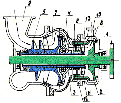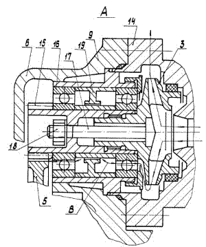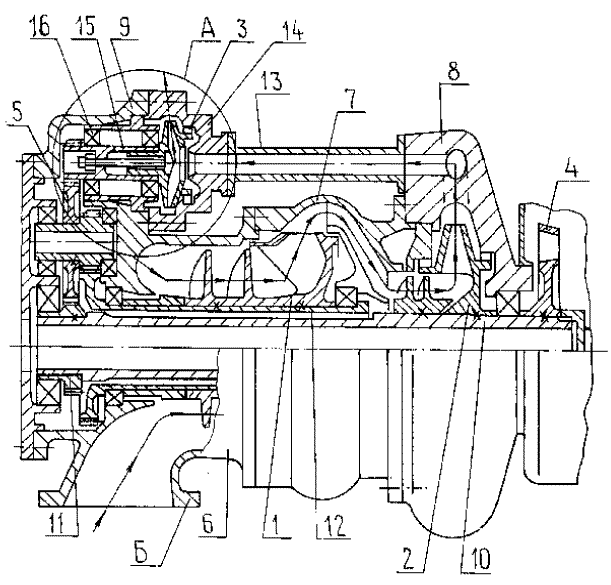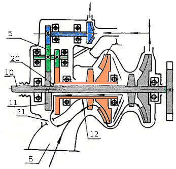 Смазка и охлаждение редуктора насоса горючего следующим образом. Горючее с выхода преднасоса 1 по каналам в литом промежуточном корпусе 7 поступает на вход насоса второй ступени 2, а также через кольцевую полость 20 - в полость редуктора 5, охлаждая и смазывая его шестерни и подшипники. Дополнительный приток компонента для смазки и охлаждения редуктора осуществляется через подшипники 16 и дозирующее уплотнение 19 из улитки корпуса 14 дожимного насоса 3. Затем жидкость из полости редуктора отводится через отводящий канал 21 на вход Б преднасоса.